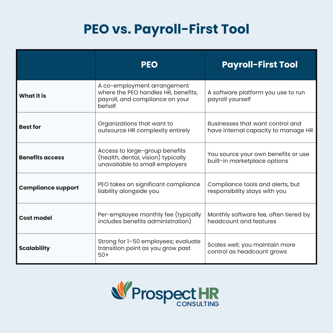 PEOs are built for outsourcing. Payroll tools are built for self-management. Be honest about your team’s capacity.